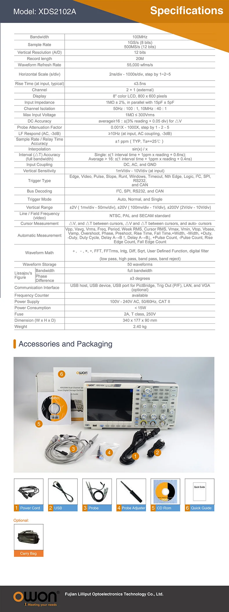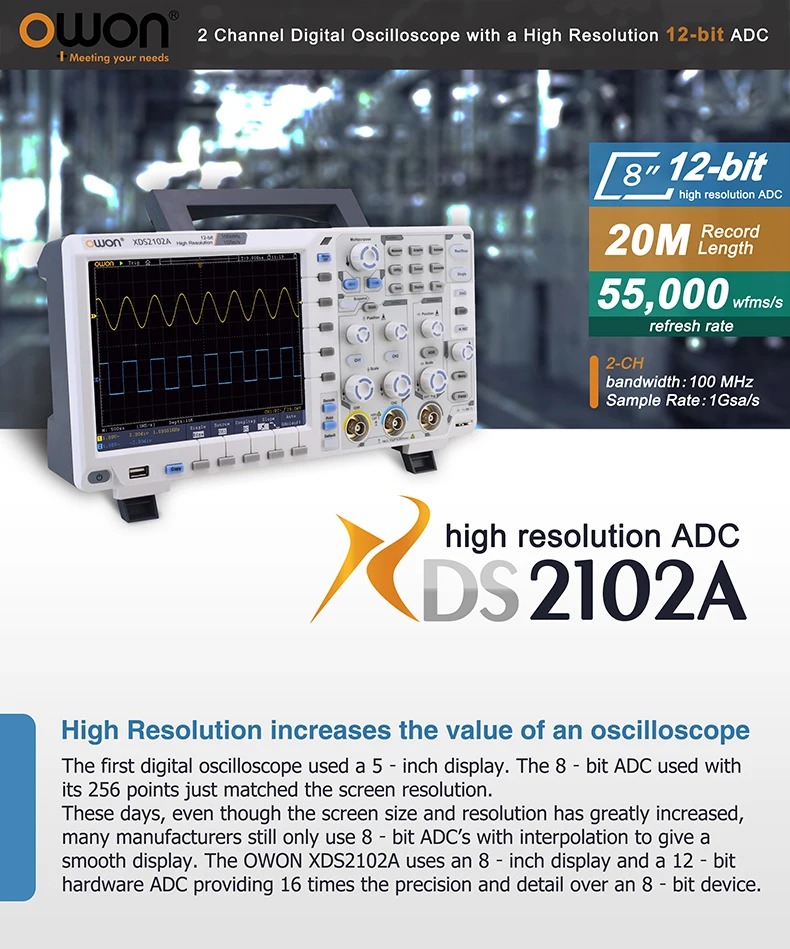OWON XDS2102A Digital Oscilloscope 100MHz 1GS/s 2 Channels+1External 20M Record Length 12-bit High Resolution ADC and 8 inch LCD